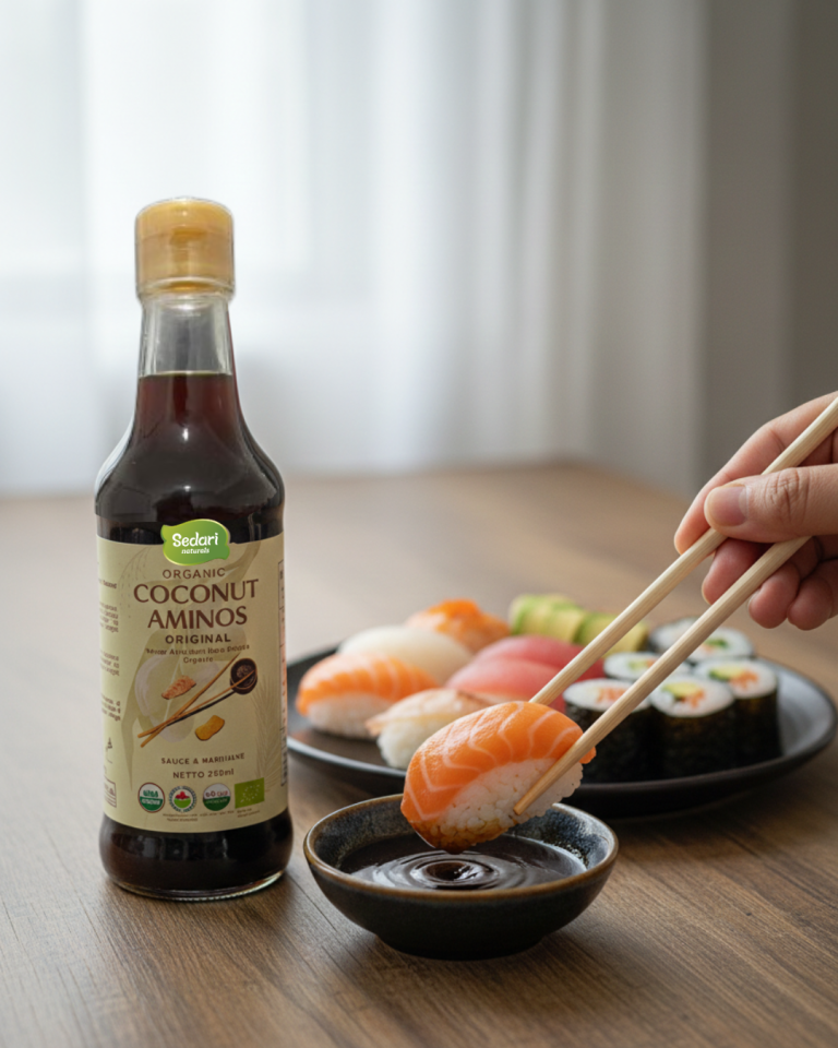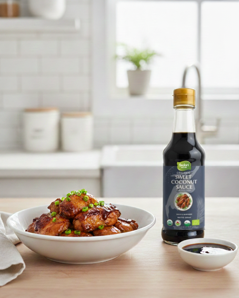 A natural fermented soy sauce alternative from coconut sap. Rich umami flavor, Soy-Free, and Low Sodium.